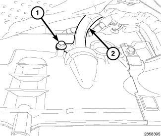 33. Install the bolt (1) securing the transmission fluid level indicator tube (2) to the transmission housing and tighten to 12 Nm (106 in. lbs.).