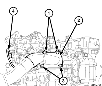 72. Install the nut (1) and bolt (4) to the support brackets of the heater core return tube (3). Tighten to 12 Nm (106 in. lbs.).