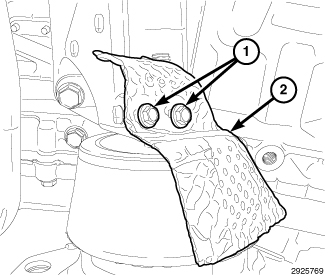 57. Install the engine mount heatshield (2) to both the left and right engine mounts with two bolts (1) tightened to 12 Nm (106 in. lbs.).