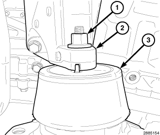 7. Align the tab on the isolators (3) with the notch in the engine mount brackets (2) and lower the engine so the weight is resting on the isolators.