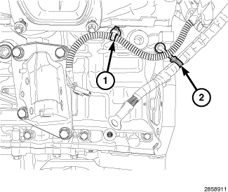 43. Engage one main wire harness retainer (1) to the engine block and one main wire harness retainer (2) to the right engine mounting bracket.