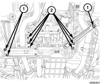 36. If equipped with AWD, raise the rear of the engine, reinstall six crossmember bolts (2) and three crossmember brace bolts (1). Tighten all bolts to 55 Nm (41 ft. lbs.).