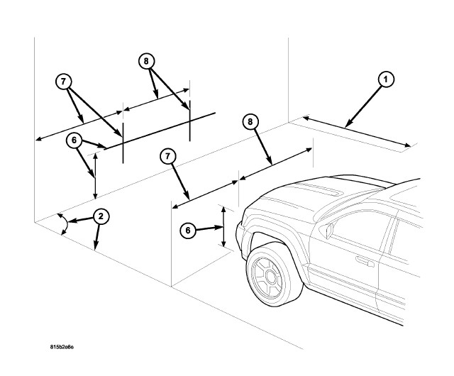 2. An adjacent wall or floor member that is perpendicular to the alignment screen can be used as the vertical zero reference. If there is no adjacent wall or floor member that is perpendicular to the screen, tape a second line on the floor perpendicular to both the alignment screen and the first line, and outboard of either side of where the vehicle will be positioned. This will be used as the vertical zero reference.