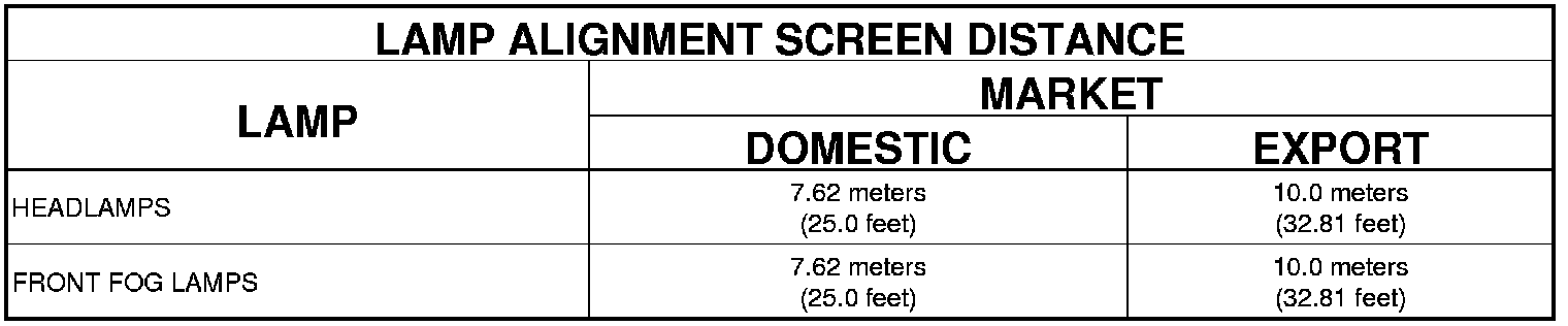 NOTE: A properly aimed front fog lamp will project a pattern on the alignment screen 100 millimeters (4 inches) below the fog lamp centerline and straight ahead of the lamp for domestic market vehicles, or to 203 millimeters (8 inches) below the fog lamp centerline and straight ahead of the lamp for export market vehicles.