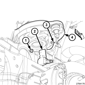 6. Remove the two nuts (1) that secure the sensor mounting bracket to the two studs on the front end sheet metal.
