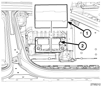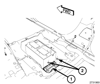 2. Install the battery hold down (1) into position and install the battery hold down retainers (2).Tighten to 20 Nm (15 Ft. Lbs.).