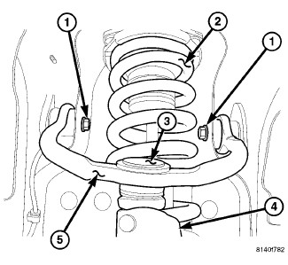 2. Install the nuts and flag bolts (1) securing the upper control arm (5) to the body and tighten to 60 Nm (44 ft. lbs.).