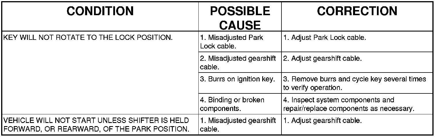2. When the shift lever is in PARK, the ignition key cylinder should rotate freely from ACC to LOCK. When the shifter is in any other gear or neutral position, the ignition key cylinder should not rotate to the LOCK position.