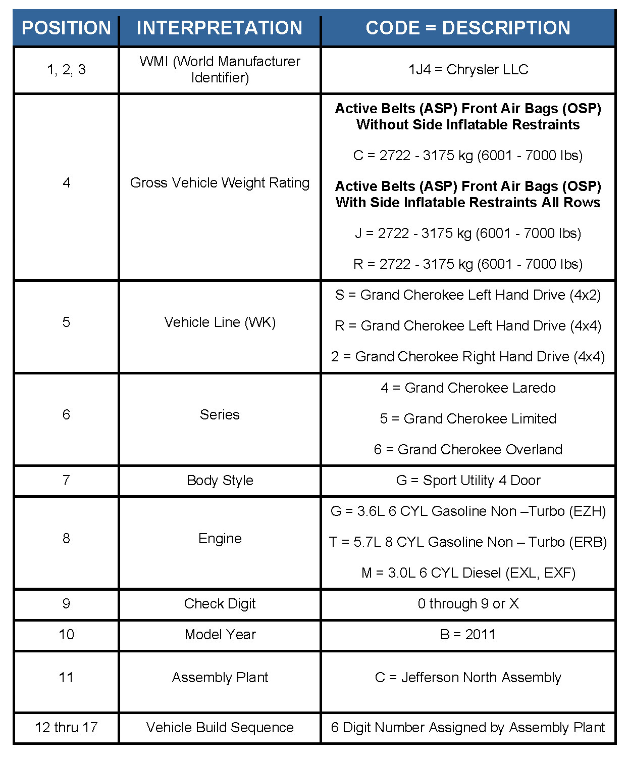 Vehicle Identification Number Decoding Chart