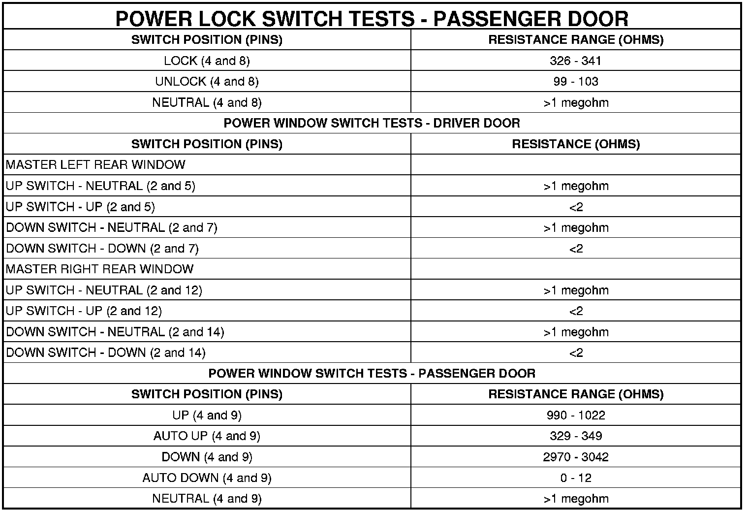 NOTE: The switches in the driver front door switch module not listed in the Switch Test Tables provide inputs to the Driver Door Module (DDM) over a Local Interface Network (LIN) data bus and cannot be resistance tested. The use of a diagnostic scan tool and the appropriate diagnostic information is required for further testing of those switches.