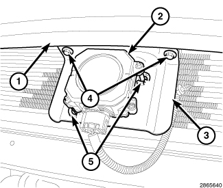 1. Install three new molded plastic ball socket clips (5) into the adaptive speed control (also known as Adaptive Cruise Control/ACC) sensor mounting bracket (3) located below the center of the front bumper support bar (1). The clips are installed from the back side of the bracket by rotating them clockwise.