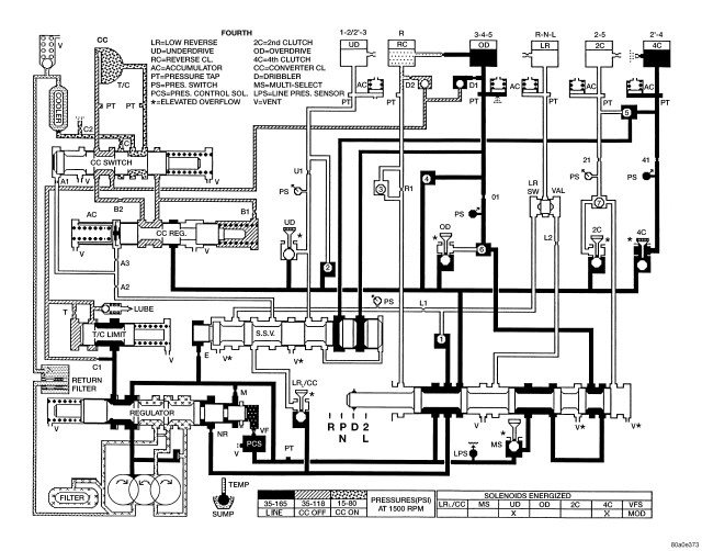 Figure 5 - HYDRAULIC FLOW IN FIRST GEAR (FROM N OR OD)