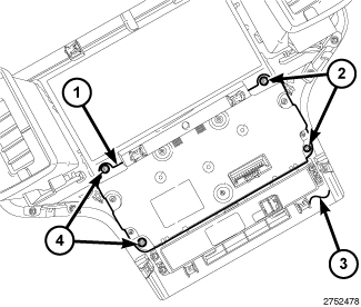 2. Install the four screws (2 and 4) that secure the A/C-heater control to the center bezel. Tighten the screws to 2 Nm (17 in. lbs.).