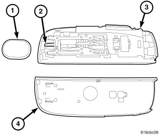 4. Install the new battery by sliding it between the latch tab and the case until it is engaged by the latch tab. The battery must be installed with the positive (+) terminal oriented toward the upper case (3).