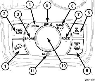 When checking or performing an alignment, vehicles equipped with Air Suspension (SER) must be in the manually selected "Sport" position (3) of the terrain select switch (10), or the Aero mode if using a scan tool. To change the ride height using the terrain select switch (10), the vehicle air suspension system must be in normal operating condition as follows:
