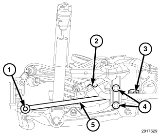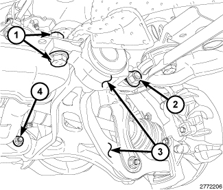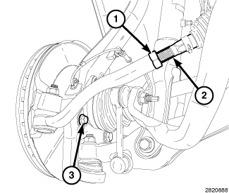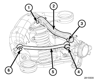 After adjustment is made tighten the lower control arm REAR PIVOT VERTICAL BOLTS (1) to 220 Nm (162 ft. lbs.), the REAR PIVOT HORIZONTAL BOLTS (2) to 90 Nm (66 ft. lbs.), and the FRONT PIVOT BOLTS (4) to 120 Nm (89 ft. lbs.).