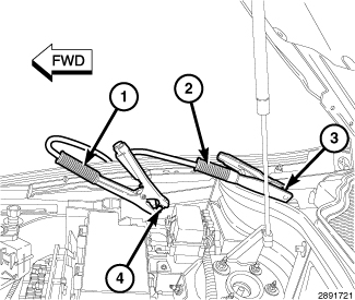 CAUTION: It is very important not to use the B+ connection at the TIPM when jump starting the vehicle. The 150 amp fuse in the fuse block that feeds the TIPM will blow. Use only the positive jump post (3) that is located in the wiper plenum on the right hand side of the vehicle.