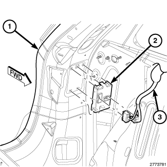 2. Move the quarter trim panel from the lower left inner D-pillar (1) far enough to access the Power LiftGate Module (PLGM) (2). Quarter Trim Panel - Removal.
