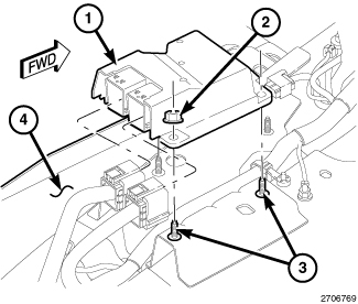 1. Carefully position the Occupant Restraint Controller (ORC) (1) onto the three weld studs (3) of the ORC bracket on the floor panel transmission tunnel (4). When the ORC is correctly positioned, the orientation arrow on the ORC label will be pointed forward in the vehicle.