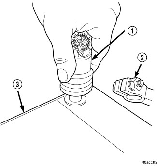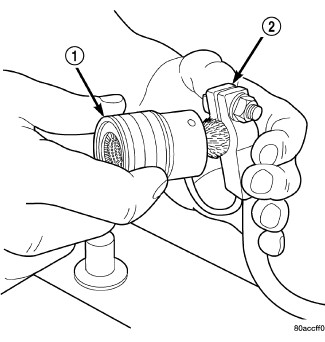 1. Clean the battery cable terminal clamps (2) of all corrosion. Remove any corrosion using a wire brush or a post and terminal cleaning tool (1), and a sodium bicarbonate (baking soda) and warm water cleaning solution.