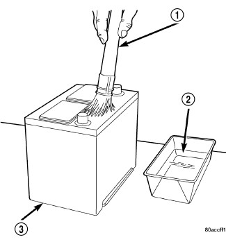 3. If the removed battery is to be reinstalled, clean the outside of the battery case (3) and the top cover with a sodium bicarbonate (baking soda) and warm water cleaning solution (2) using a stiff bristle parts cleaning brush (1) to remove any acid film. Rinse the battery with clean water. Ensure that the cleaning solution does not enter the battery cells through the vent holes. If the battery is being replaced, confirm that the replacement battery is the correct size and has the correct ratings for the vehicle.