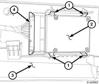 2. Position the power seat switch to the seat cushion side shield (3) and engage the four retaining tabs (1) to the side shield. Make sure the retaining tabs are fully engaged.