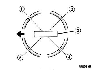 12. Position piston ring end gaps as shown. It is important that expander ring gap (5) is at least 45° from the side rail gaps, but not on the piston pin center or on the thrust direction.