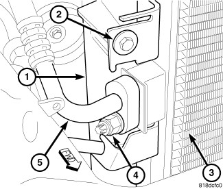 6. Connect the A/C discharge line (5) to the A/C condenser and install the retaining nut (4). Tighten the nut to 22.5 Nm (200 in. lbs.).