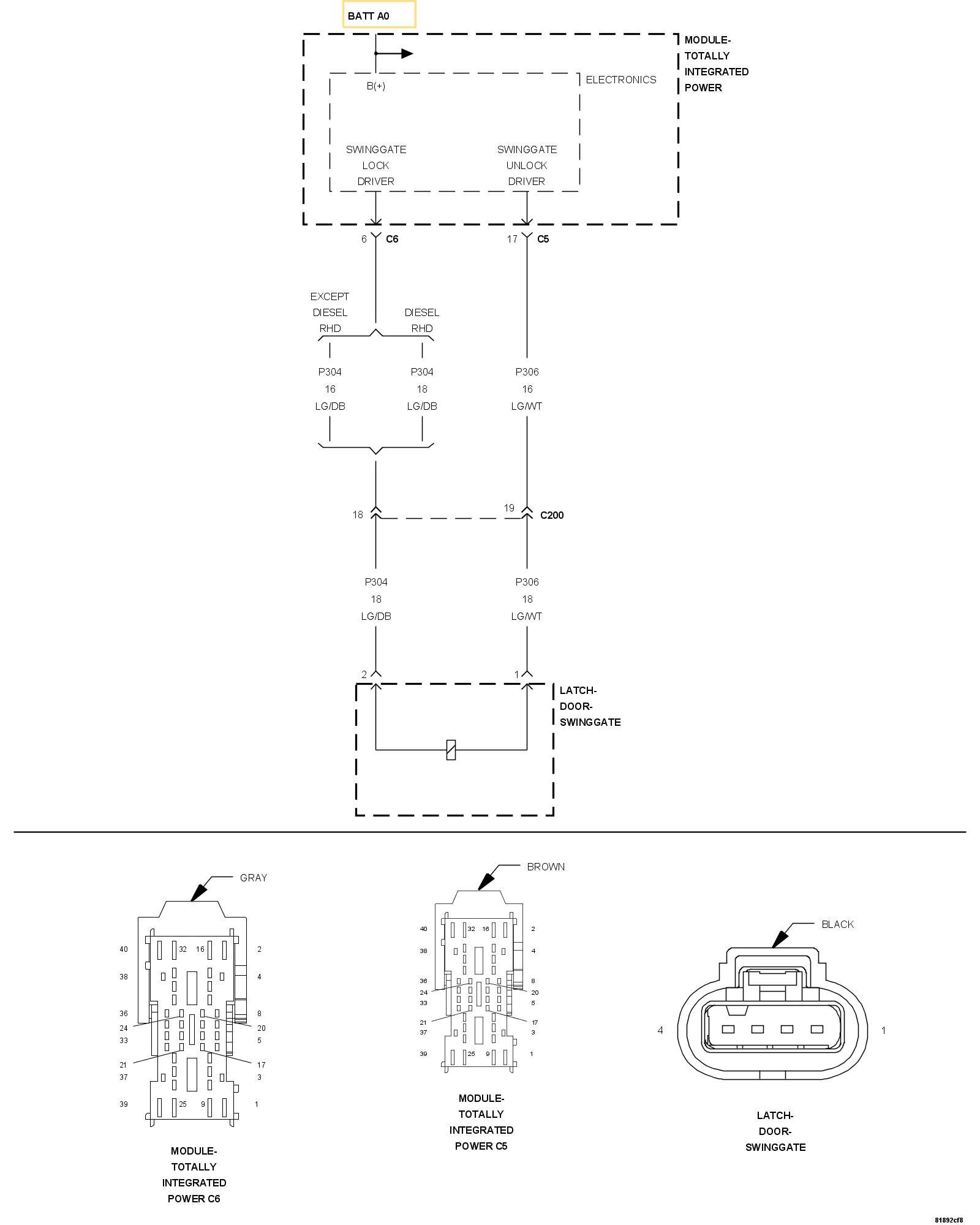 3. Measure the resistance of the (P306) Swing Gate Unlock Driver circuit between the Latch connector and the TIPM C5 connector.