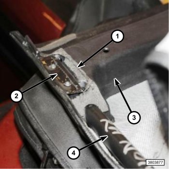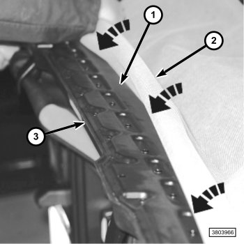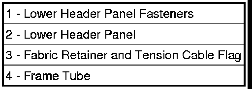 3. Remove the fasteners that hold the fabric retainer (2) and tension cable flag to the lower plastic header panel (3).