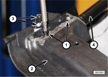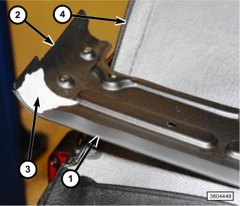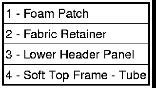 4. Remove the fasteners (1) that hold the lower plastic header panel (2) to the soft top frame tube (4).