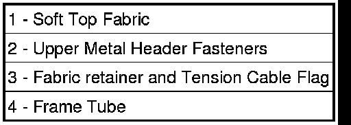 5. Pull soft top fabric (1) back from sides of metal upper header to remove retaining fasteners (2) hidden by the soft top fabric (1) from the soft top frame tube (4).