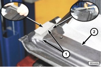 2. Using a (C-4755) remove the foam patches (1) covering the soft top fabric retainer (2) and tension cable flag