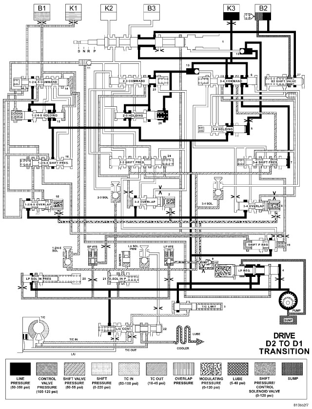 Figure 21 - HYDRAULIC FLOW IN DRIVE - SECOND TO FIRST GEAR TRANSITION