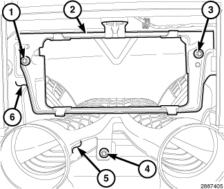 2. Install the three screws (1, 2 and 3) that secure the instrument panel duct assembly to the instrument panel support (5). Tighten the screws to 1.2 Nm (10 in. lbs.).