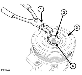 4. Using A/C Snap Ring Pliers (1) or equivalent, install the snap ring (2) that secures the pulley and bearing assembly (3) to the front of the A/C compressor (4). Be certain that the snap ring is fully and properly seated in the groove.