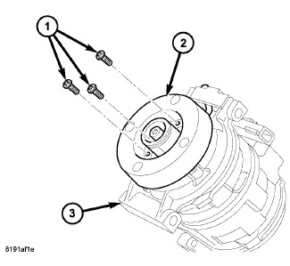 2. Install the three screws (1) that secure the A/C clutch coil to the front of the A/C compressor. Tighten the screws to 5 Nm (44 in. lbs.).
