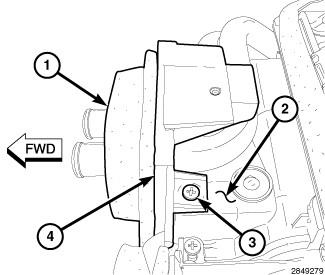 2. Position the flange (4) to the front of the HVAC housing (2) and engage the plastic retaining tab. Make sure the retaining tab is fully engaged.