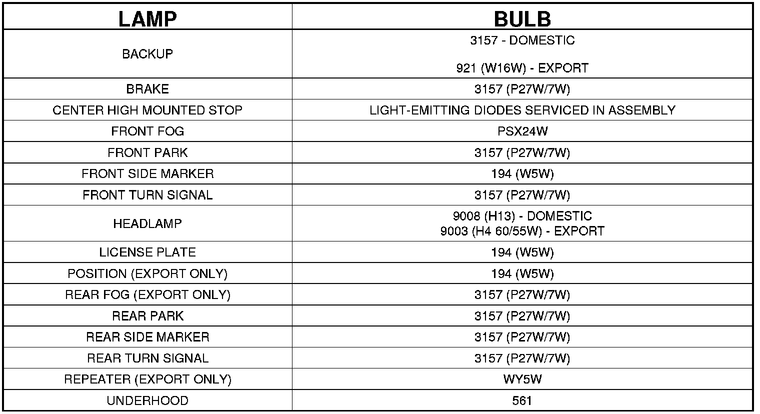 BULB APPLICATION TABLE