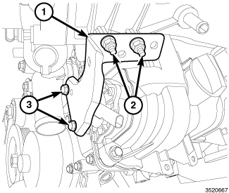 5. Install the left front upper intake manifold support bracket (1) with two nuts (2) and two bolts (3). Tighten the nuts (2) to 10 Nm (89 in. lbs.) and tighten the bolts (3) to 10 Nm (89 in. lbs.).