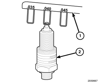 1. Check and adjust the spark plug gap with a gap gauging tool (1)