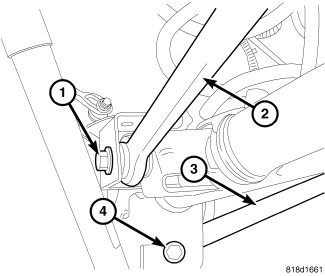 3. Install the axle mounting bolt (4) and nut at the axle bracket finger tight.
