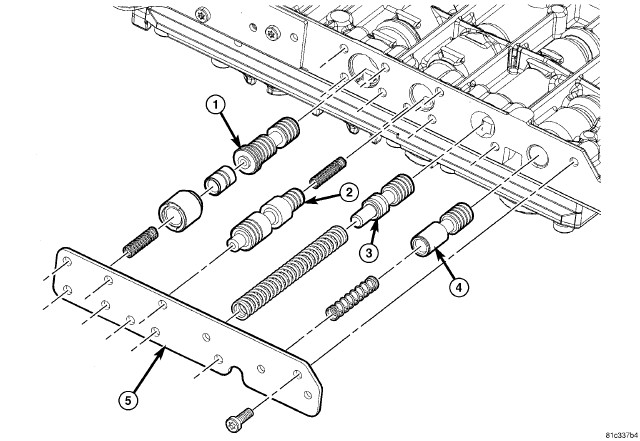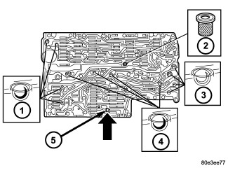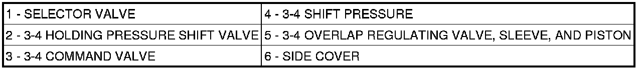 27. Remove 3-4 Holding Pressure Shift Valve assembly (2), 3-4 Command Valve assembly (3), 3-4 Shift Pressure Shift Valve assembly (4) and the 3-4 Overlap Regulating Valve Sleeve and Piston assembly (5) from the valve body.