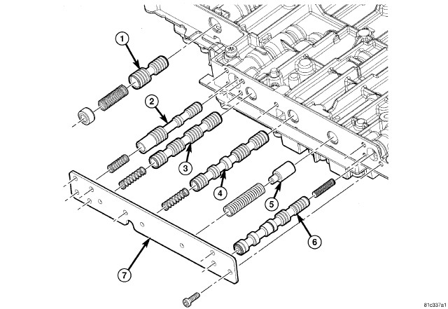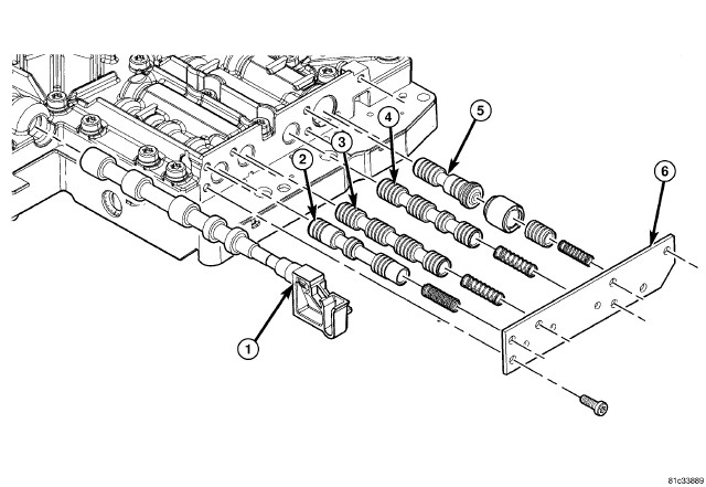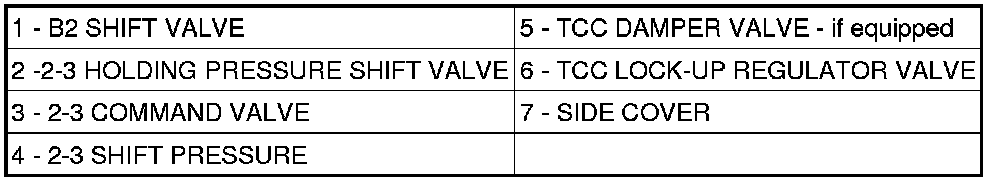 17. Remove the B-2 Shift Valve assembly (1), 2-3 Holding Pressure Valve assembly (2), 2-3 Command Valve assembly (3), 2-3 Shift Pressure assembly (4), TCC Damper Valve (5) if equipped and the TCC Lock-Up Regulator Valve assembly (6) from the valve body.