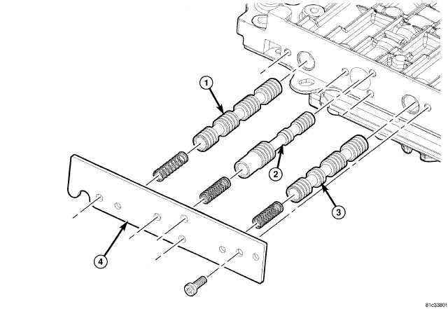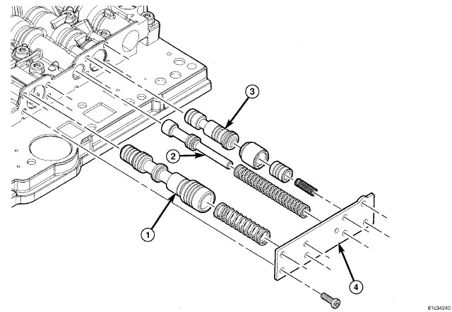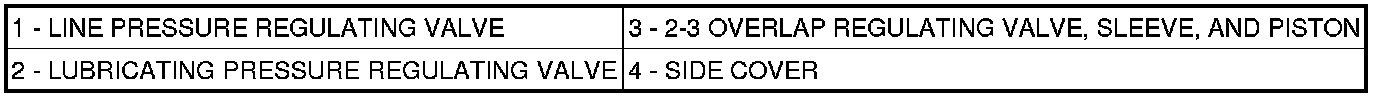 20. Remove the 1-2 / 4-5 Overlap Regulating Valve, Sleeve, and Piston assembly (1), Shift Pressure Regulating Valve assembly (2), Control Valve Pressure Regulator assembly (3), and the Shift Solenoid Pressure Regulating Valve (4) from the valve body.