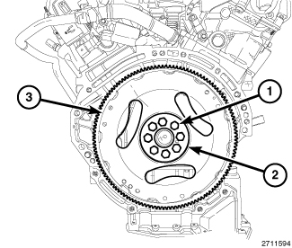3. Tighten the flexplate retaining bolts (1) to 95 Nm (70 ft. lbs.) in a criss-cross pattern.