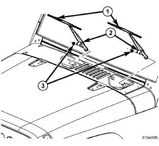 1. The front wiper arms (1) must be indexed to the pivot shafts with the front wiper motor in the park position to be properly installed. Position the wiper arm pivot end onto the wiper pivot shaft so that the lug on the pivot shaft engages the pocket on the underside of the wiper arm pivot end.