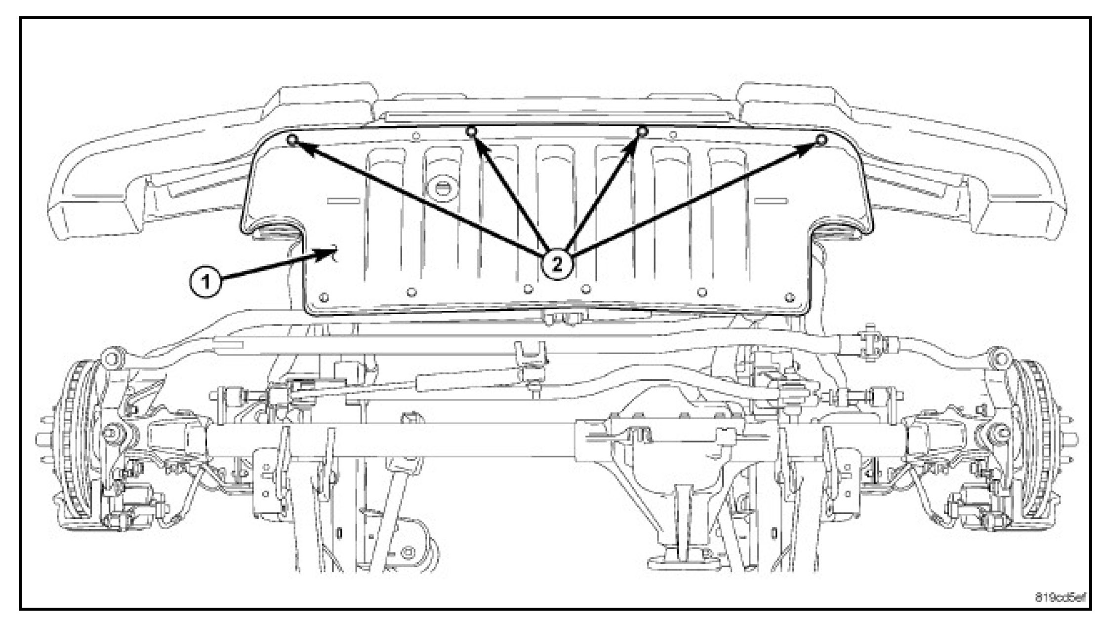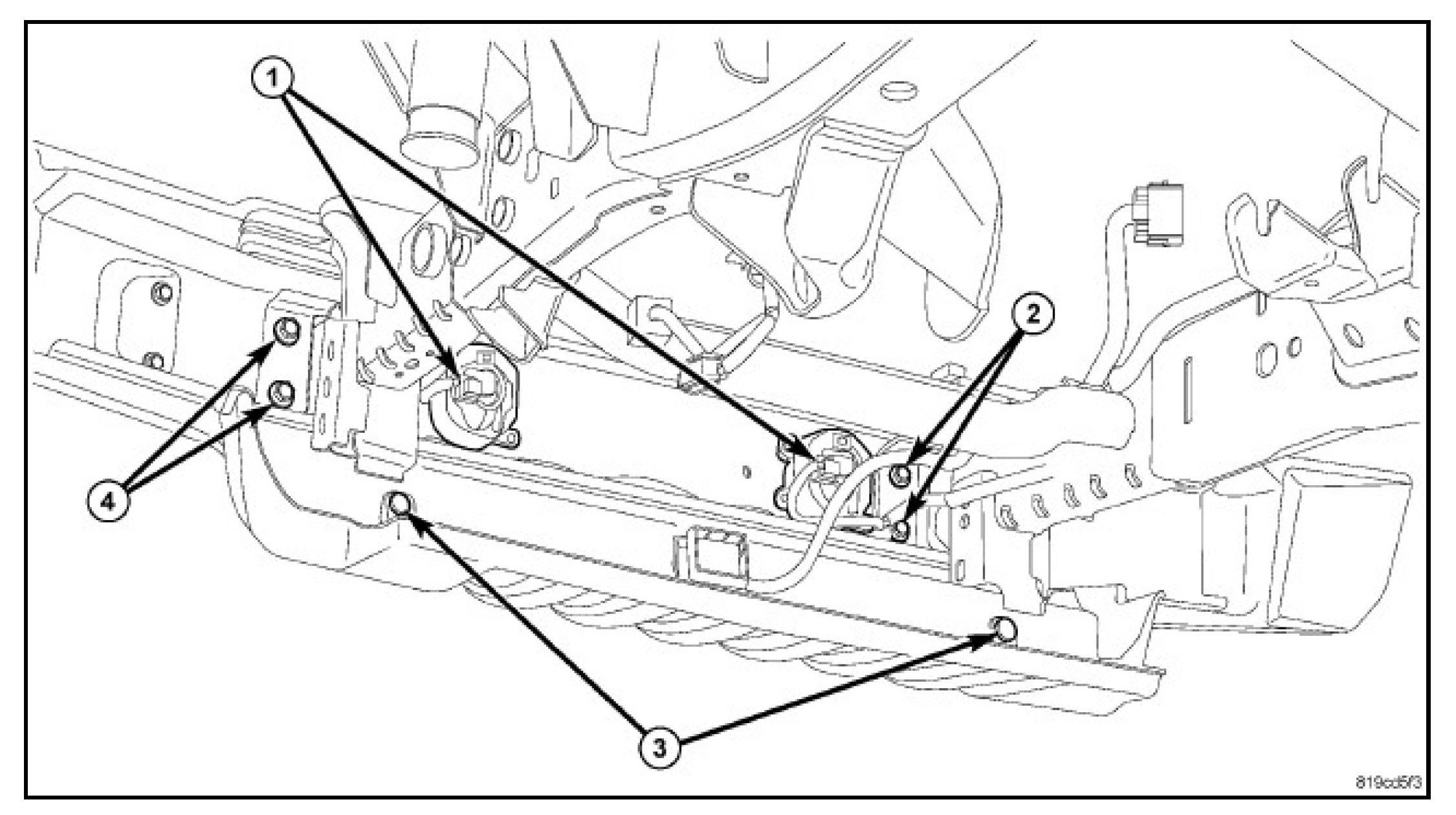 1. Install the bumper and install the inner (2) and outer support bolts (4).