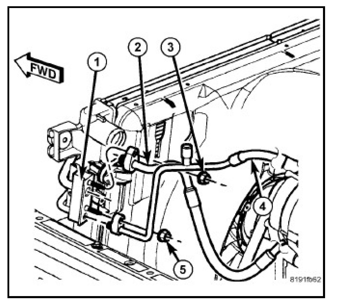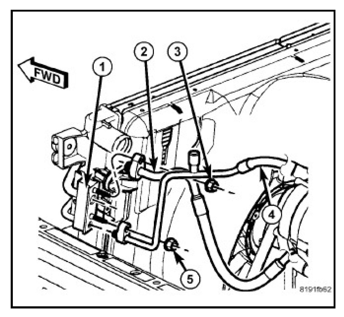 8. Remove the nuts (3 and 5) that secure the A/C discharge line (2) and A/C liquid line (4) to the A/C condenser (1).