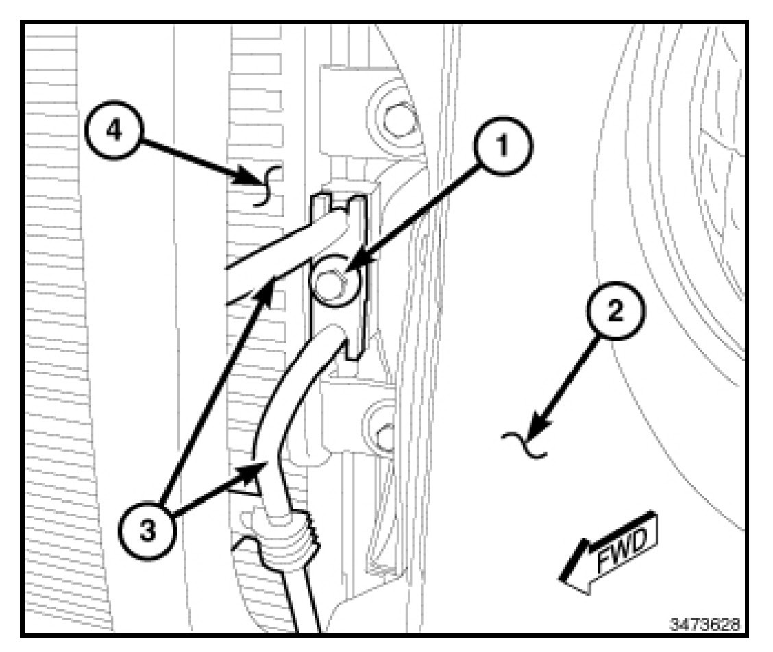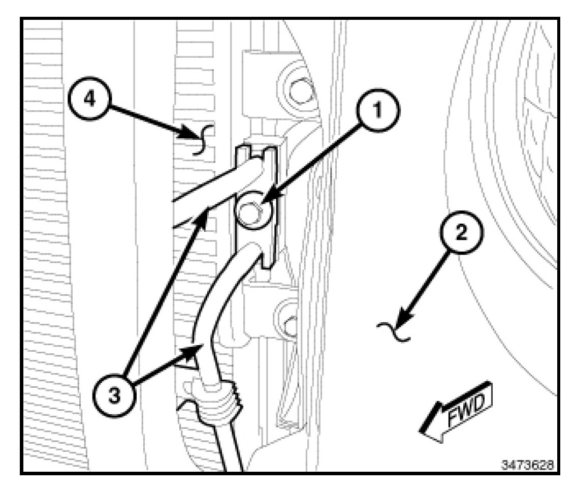 12. When equipped with automatic transmission, remove the bolt (1) and disconnect the transmission cooler lines (3) from the transmission cooler (4).